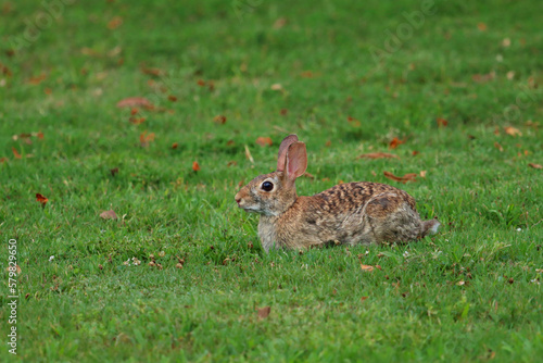Fototapeta premium Eastern Cottontail Rabbit in Grass with Leaves