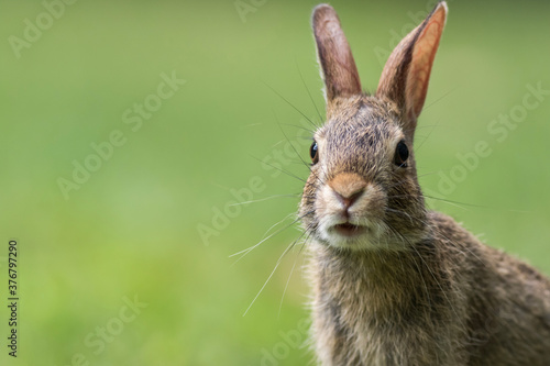 © rabbitti, Fototapeta premium Eastern Cottontail Rabbit, Sylvilagus floridanus, closeup in the grass soft light copy space