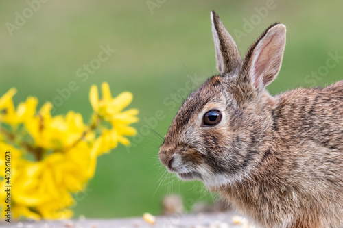 © rabbitti, Fototapeta premium Eastern Cottontail Rabbit, Sylvilagus floridanus, Springtime in grass with beautiful soft sunlight