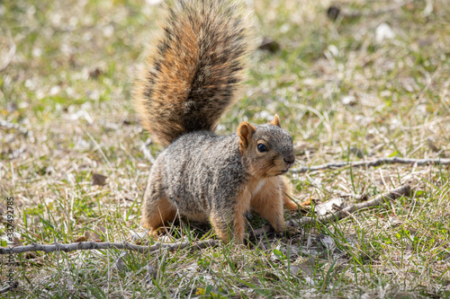 © J.A., Naklejka premium eastern fox squirrel looking for food in the park on a sunny day