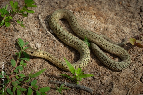 © Mike Wilhelm, Fototapeta premium Eastern Garter snake with rare golden color and pattern macro portrait