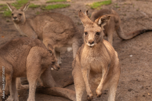 © Nikola, Naklejka premium Eastern grey kangaroo mob (Macropus giganteus) on sandy ground, juvenile standing in foreground, close-up wildlife shot with shallow depth of field, grassland habitat in Australia