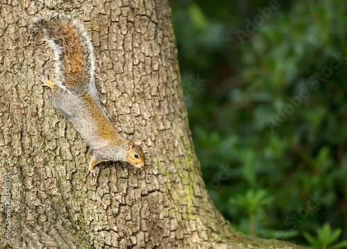 Fototapeta premium Eastern grey squirrel climbing on the tree trunk, UK.