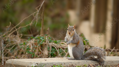 © Mark Castiglia, Fototapeta premium Eastern grey squirrel sits up to look at viewer
