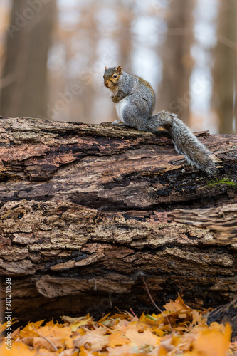 © Hummingbird Art, Fototapeta premium Eastern grey squirrel taken on a fall background of golden leaves, in Quebec, Canada.