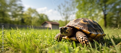 © Gular, Fototapeta premium Eastern Hermann's tortoise Testudo hermanni boettgeri on vibrant green lawn under soft sunlight with blurred trees and house in the background