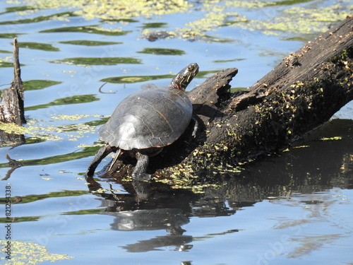 Obraz premium Eastern painted turtle basking in the warmth of the sun, within the wetlands of Wildwood Park, Dauphin County, Harrisburg, Pennsylvania.