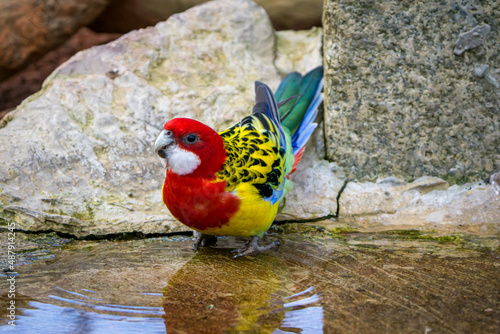 © Marlon, Naklejka premium Eastern rosella. Australian parrot drinking at water's edge.