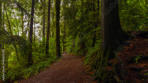 © Andrew, Obraz premium Easy access urban forest trail near Simon Fraser University on Burnaby Mountain, BC, Canada after rain during fall.