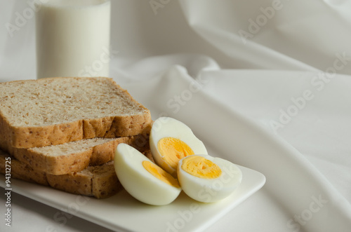 Fototapeta premium Easy Breakfast with Whole Grain Bread, Boiled Egg and Milk.