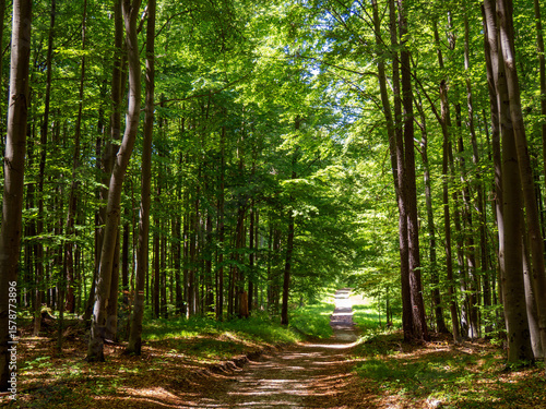 © Nostromo Trykowski, Obraz premium Easy gravel path in the mountain forest between tall trees. Dense woods, shadow and dark, calm, active time in nature