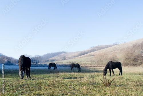 © Tamas, Obraz premium Eating a horse in the meadow at morning