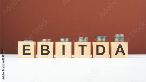 © Maks_Lab, Obraz premium EBITDA text on wooden blocks with coins on brown background