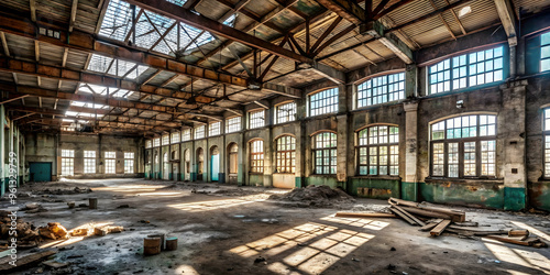 © Joesunt, Fototapeta premium Echoes of Industry: A haunting panorama of an abandoned factory, sunlight streaming through broken windows onto a dusty floor, remnants of a bygone era.