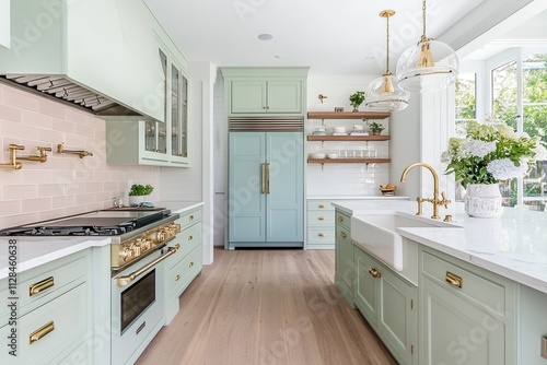 Fototapeta premium Eclectic kitchen with pastel green cabinets and pink backsplash