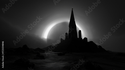 © Wong, Obraz premium Eclipsed ringed planet rising over ruined temple silhouette on rocky ground with soft cosmic glow and moody shadows