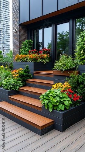 Fototapeta premium Eco cityscape eco friendly concept, A vibrant garden with colorful flowers adorns wooden steps, leading to a modern entrance, surrounded by greenery and urban architecture.