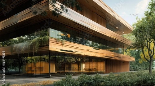 Fototapeta premium eco-conscious building facade with layered wood cladding, each layer designed...