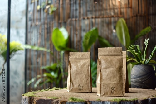 © kittipoj, Obraz premium Eco-Friendly Biodegradable Packaging in Natural Setting