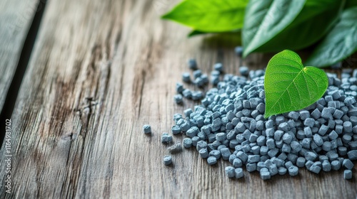 Fototapeta premium Eco-friendly biodegradable pellets on wooden surface with green leaves, showcasing sustainable materials for environmentally conscious manufacturing solutions.