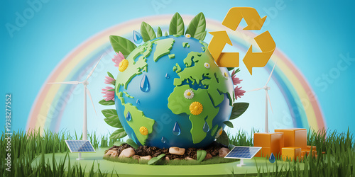 Naklejka premium Eco friendly earth with leaves and recycling symbol, green technology