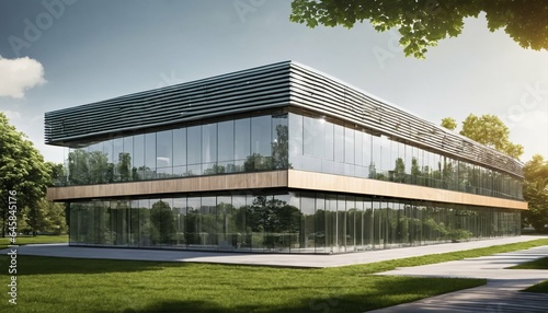 Obraz premium Eco-Friendly Glass Office: Sustainable Building with Trees and Green Environment