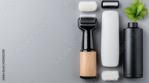 Naklejka premium Eco-friendly grooming tools and products on grey background