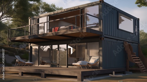 © QuietWord, Obraz premium eco friendly hotel building made from used shipping container box, environmental preservation concept, generative ai