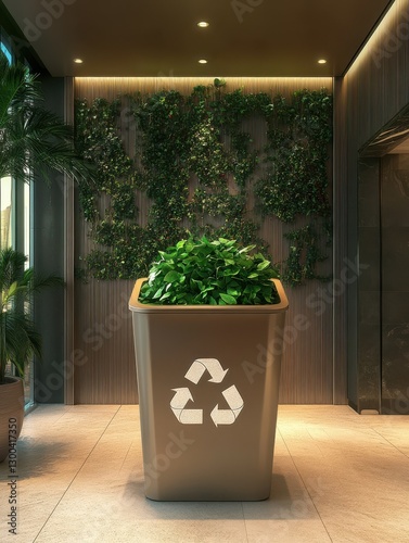 Fototapeta premium Eco-Friendly Hotel Lobby: A recycling bin with the universal symbol in the...