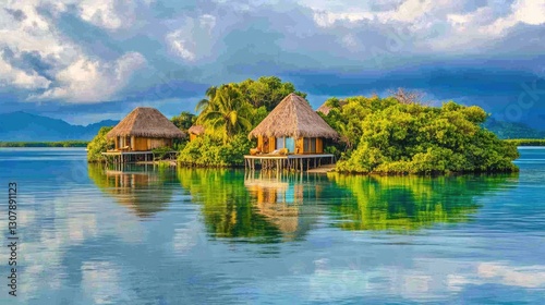 Naklejka premium Eco-friendly island resort with thatched-roof bungalows and solar-powered amenities.