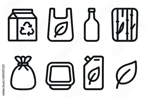 Fototapeta premium Eco-friendly linear icon set. featuring recycled, bag, bottle, bamboo, packaging, container, leaves symbols.