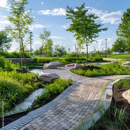 Fototapeta premium Eco friendly Park with Rain Gardens and Permeable Pathways for Sustainable...