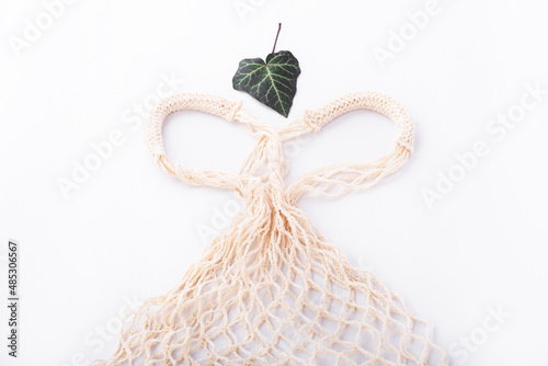 Fototapeta premium Eco friendly string bag and green leaf on white background, responsible consumption. zero waste concept.