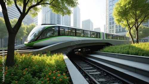 Naklejka premium Eco-friendly Transit Glides on Elevated Tracks Through Lush Greenery, Highlighting Sustainable Urban Living and Green Technology
