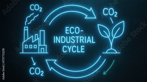 © ANNetz_PK, Naklejka premium Eco industrial cycle neon illustration showing plasma technology for CO2 recycling and green steel industry promoting circular manufacturing and sustainable process with plant and factory symbols