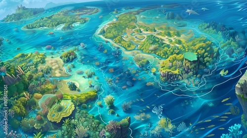 Fototapeta premium Eco-themed topographic map, highlighting vibrant coral reefs and dense...