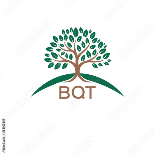© nazmun, Obraz premium Eco Tree Logo with BQT Text – Green Nature Concept Emblem Design. BQT Letter Logo.