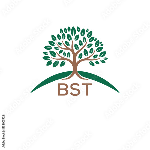 © nazmun, Obraz premium Eco Tree Logo with BST Text – Green Nature Concept Emblem Design. BST Letter Logo.