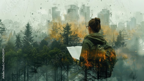 © rookielion, Obraz premium Ecologist studying biodiversity in a forest capturing the richness of habitats and population dynamics