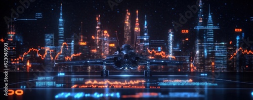 Fototapeta premium Economic charts overlay a futuristic aerospace industry skyline, symbolizing...
