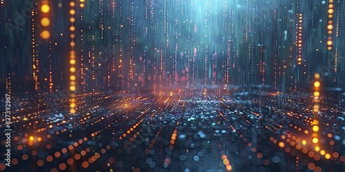 © Manyapha, Obraz premium Economic downturn visualized through digital rain of falling stocks, wide view with matrix-like falling numbers and dark background, minimal style
