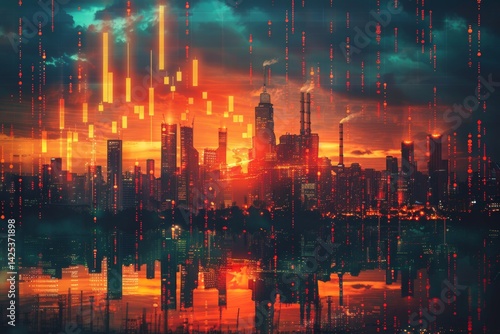 © Elbie, Naklejka premium Economic growth theme illustrated with layered upward-trending arrows and blended GDP charts alongside industrial skyline silhouettes and cloud overlays. Economic concept