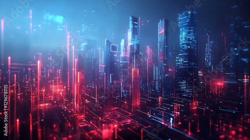 Fototapeta premium Economic growth visualization, futuristic city with financial data overlay,...