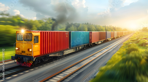 © Steve, Fototapeta premium Economic Pulse: Freight Train Rolling Through the Sunset