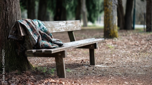 © Kannika, Naklejka premium Economic struggles poverty crisis. A weathered bench under a tree with a blanket draped over it, surrounded by fallen leaves.