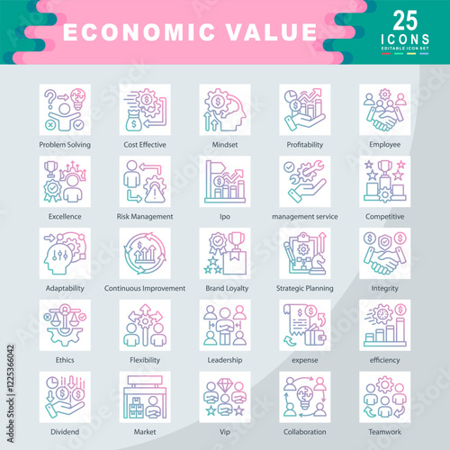 Fototapeta premium Economic Value icon set containing Problem Solving, Cost Effective, Mindset, Profitability, Employee, Excellence, Risk, Ipo, management service, Competitive, Adaptability icon. Simple gradian vector
