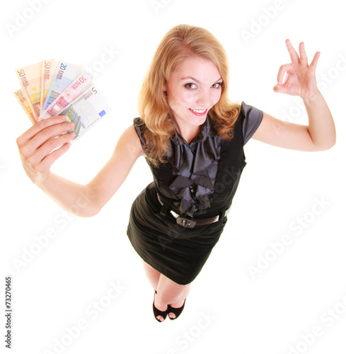 © Voyagerix, Obraz premium Economy finance. Woman holds euro currency money.