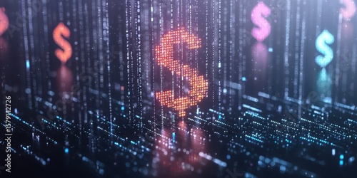 © Po, Fototapeta premium Economy forex background concept. Abstract digital representation of currency symbols and data streams.