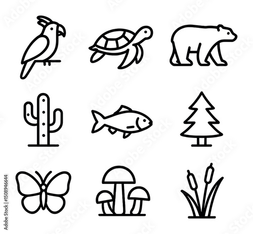 Fototapeta premium Ecosystem Biodiversity Icons. Outline icon set of ecosystem biodiversity: tropical bird, sea turtle,