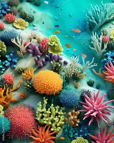 © Oofy, Fototapeta premium Ecosystem layout flat design top view ocean theme 3D render Tetradic color scheme